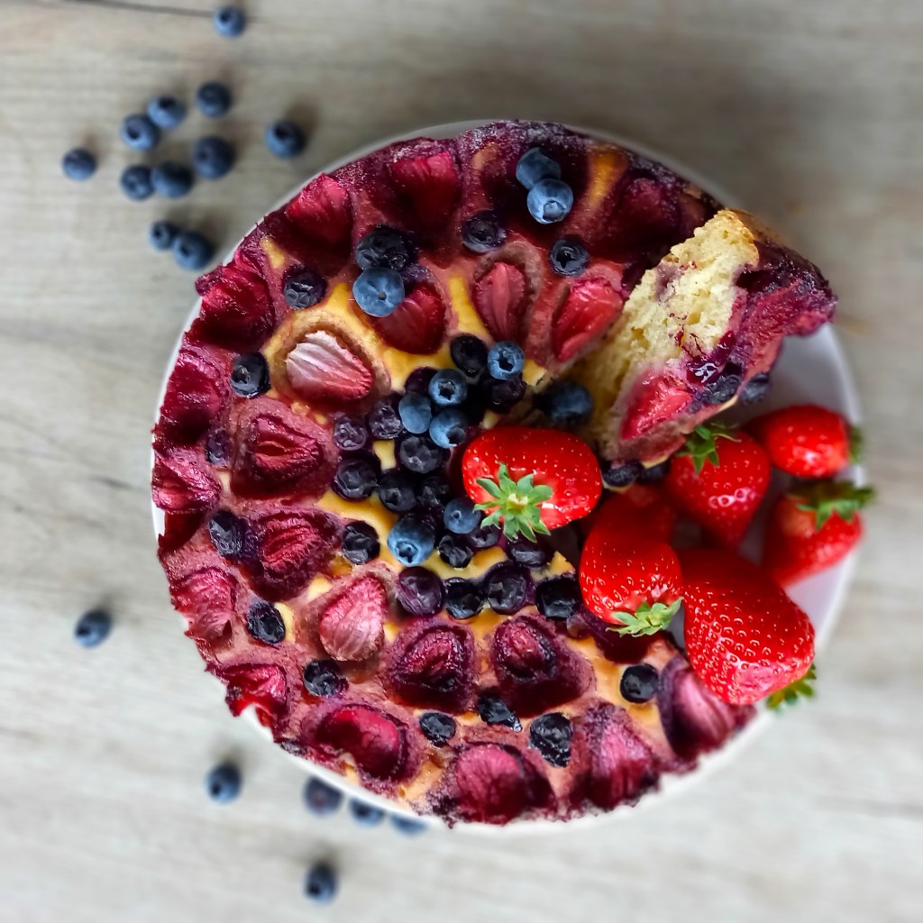 Zgubnym jest fakt, że sezon na truskawki zaczyna się szybciej, niż sezon bikini. Truskawek nie mogłam się już doczekać, więc użyłam mrożonych – sprawdziły się równie dobrze, co świeże. Do tego ciasta można zresztą użyć także jagód, malin, porzeczek czy brzoskwiń. Ma konsystencję mokrego biszkoptu, jest puszyste i miękkie. No i przygotowanie go trwa dosłownie kilka minut. Pamiętajcie tylko, żeby w przerwie między kolejnymi kawałkami pójść na rower albo chociaż na spacer; co prawda cukru jest w nim stosunkowo niewiele, ale wciąż jest to ciasto.